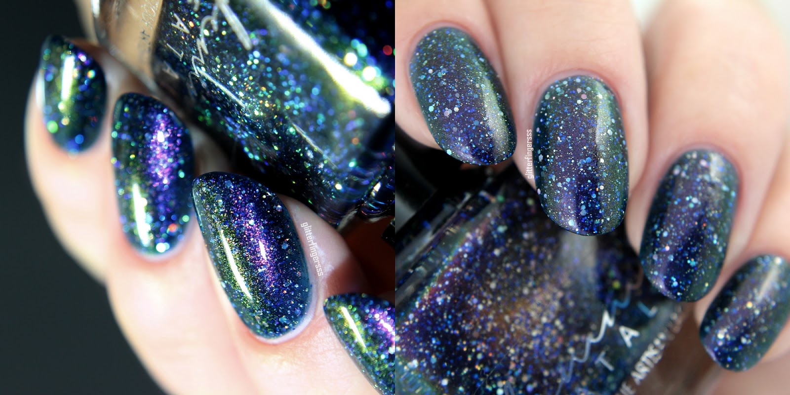 It's a deep navy blue base with cobalt blue holo microglitters, a little bit bigger silver holo glitters and a shimmer that shifts from a strong green to gold to orange to red to pink.