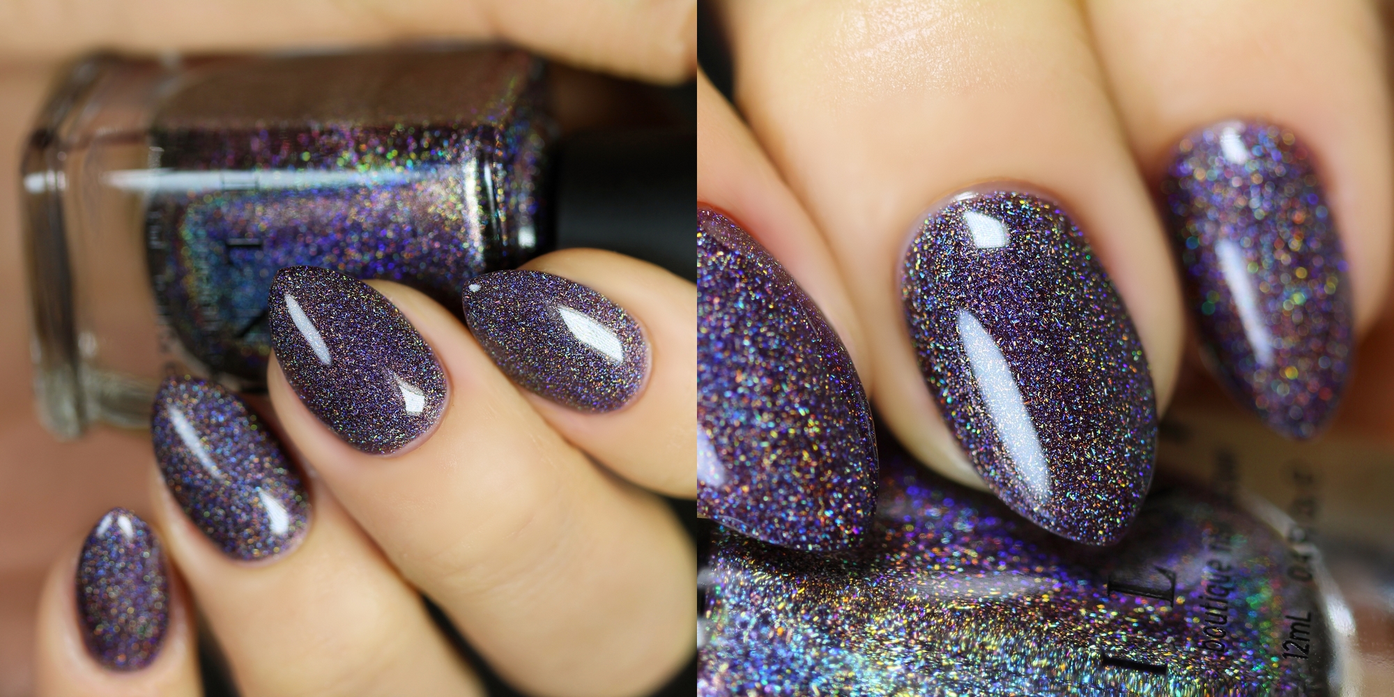 It's a dark, dusty, undersaturated plum base with holo flakes.