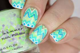 Today's theme was chevron, which I actually really like, but don't use to often. For the base I used KBShimmer Daisy About You, which was already on my nails. Fro the chevrons I used a mint and a turquoise akrylic paint. Everything is handpainted btw.